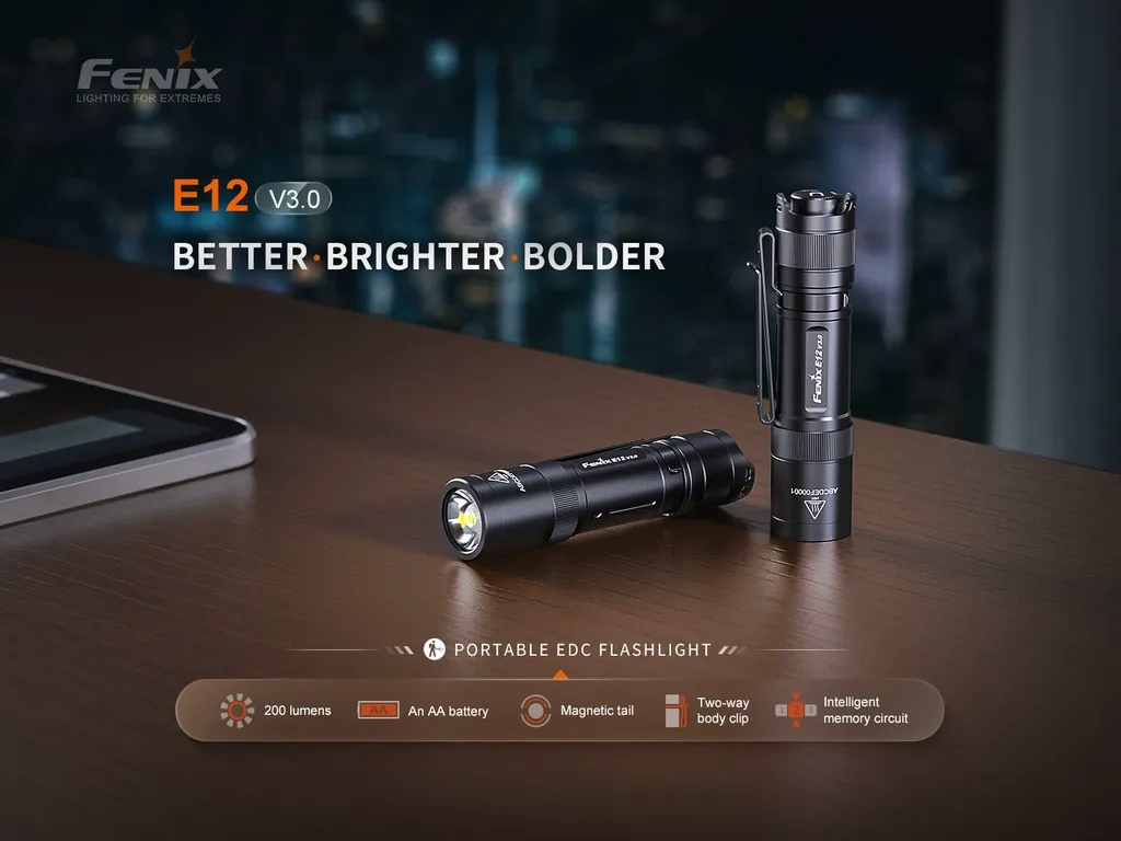 Discover the Fenix E12 V3.0 flashlight, a versatile EDC tool perfect for everyday use in Canada. This compact flashlight, powered by a single AA battery, delivers an impressive 200 lumens of brightness with a reach of 78 meters. Ideal for outdoor adventures or daily tasks, the E12 V3.0 features three lighting modes: high, medium, and low. With its IP68-rated waterproof design and 1-meter impact resistance, this flashlight is built for durability. The magnetic tail cap and two-way body clip offer hands-free convenience, while its zero-drain standby design ensures long-lasting performance. Upgrade your lighting solution with Fenix's reliable technology.