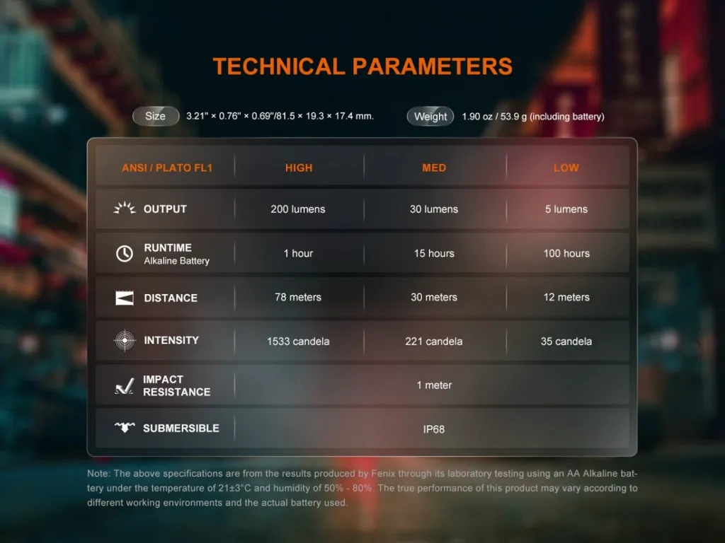 • 200 lumens maximum output and 78 meters maximum beam distance.