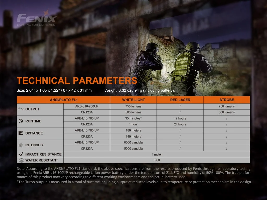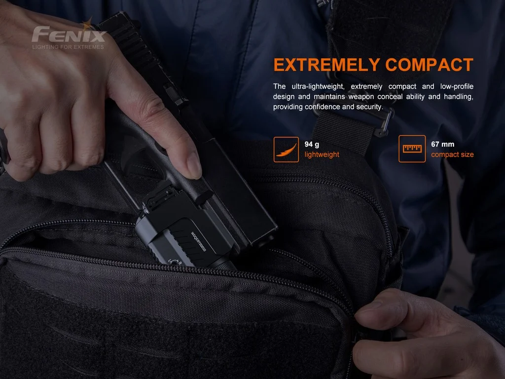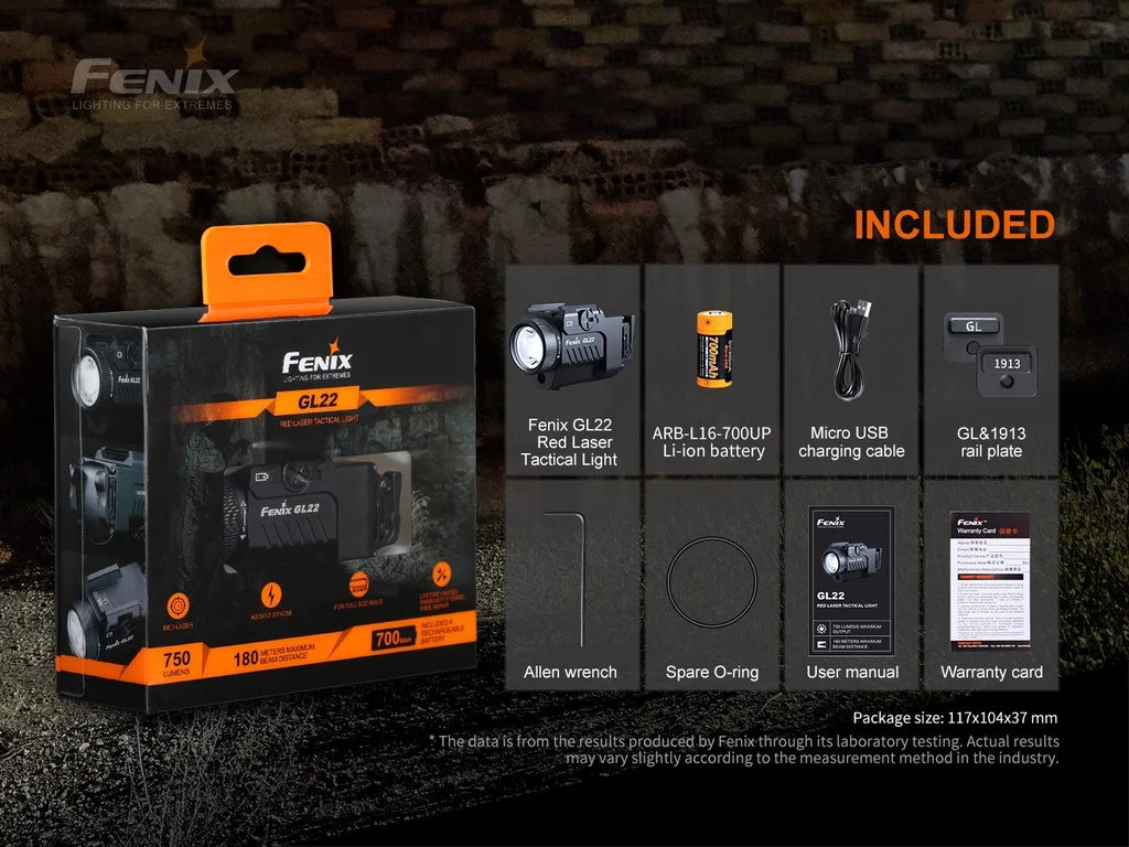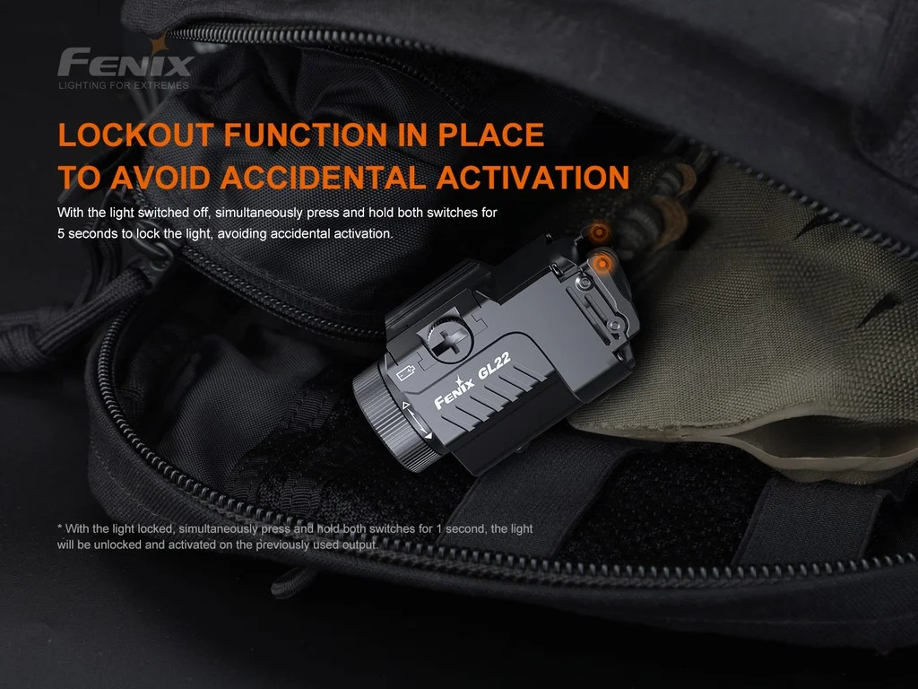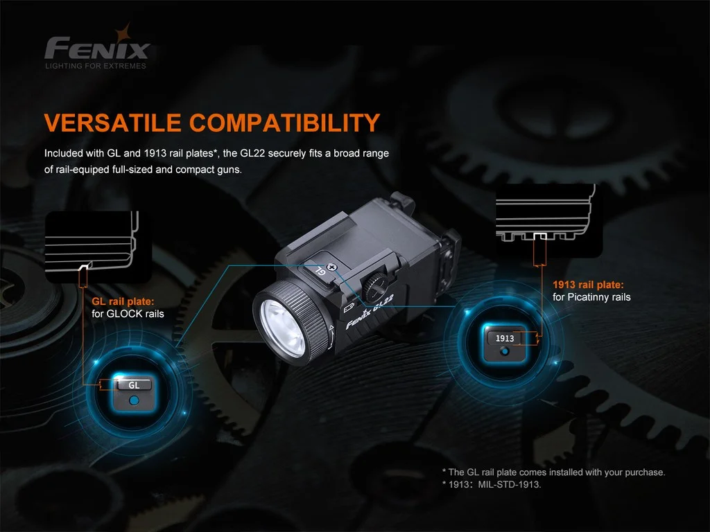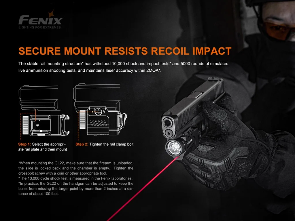 The Fenix GL22 is a 750-lumen pistol-mounted light with a 180-meter beam and an integrated red laser sight for fast aiming. Designed for rail-equipped handguns, it features ambidextrous dual tail switches, a Glock rail plate pre-installed (Picatinny plate included), an IP66-sealed aluminum body, and runs on the included ARB-L16-700UP 16340 rechargeable battery or a CR123A.