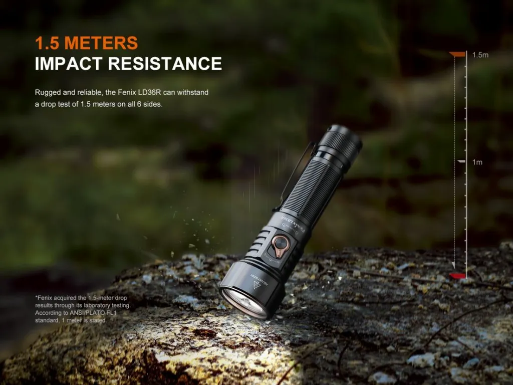 Discover the Fenix LD36R, a high-performance flashlight offering an impressive 3600 lumens and a 385-meter beam distance, perfect for all your lighting needs in Canada. This rechargeable flashlight features five white light modes and six vibrant color modes, including arctic green and sunrise red. Powered by a single ARB-L21-6000 battery, the LD36R offers versatile lighting options for any adventure. With an IP68 waterproof rating and 1-meter impact resistance, this Fenix flashlight is built to withstand tough conditions. The integrated waterproof USB Type-C port ensures easy recharging on the go. Perfect for outdoor enthusiasts and professionals alike.