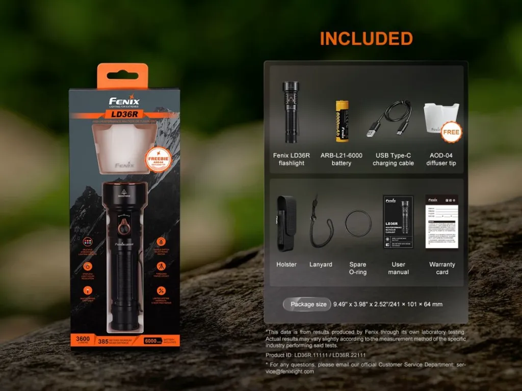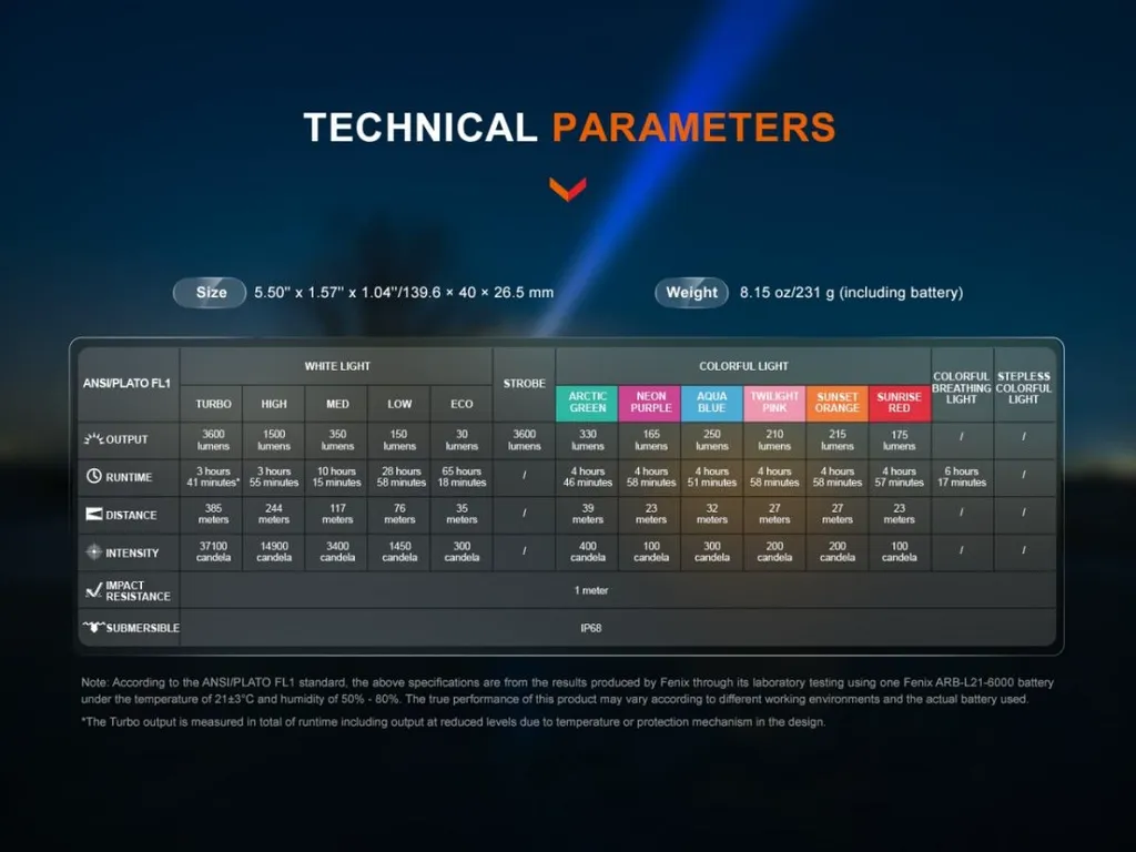 • Powered by an included Fenix ARB-L21-6000 battery.