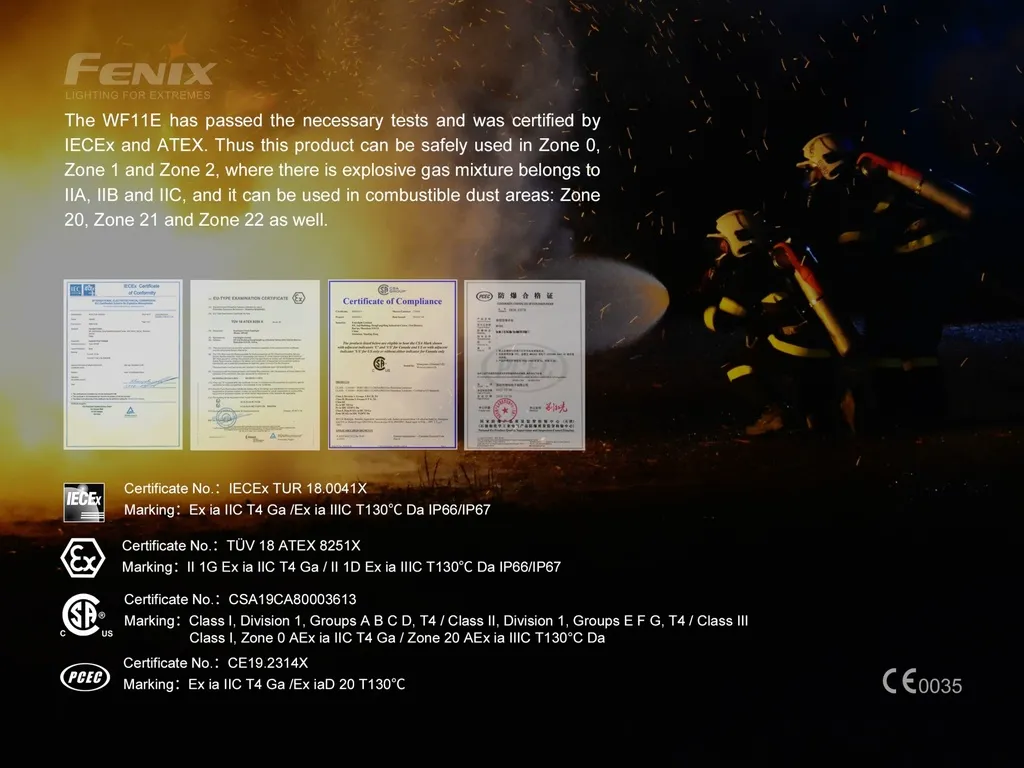 Discover the Fenix WF11E flashlight, a top choice for professionals in Canada needing reliable lighting in hazardous environments. With its 200 lumens output, this intrinsically safe flashlight is perfect for areas with explosive gases or combustible dust. Certified by IECEx, ATEX, and CSA, it's ideal for Zone 0, Zone 1, and Zone 2 gas environments, as well as Zone 20, Zone 21, and Zone 22 dust areas. Designed with a magnetic tailcap and body clip, it offers hands-free convenience. This Fenix flashlight is battery-operated, waterproof, and impact-resistant, ensuring durability in challenging conditions. Perfect for industries like petroleum, chemical, and firefighting.
