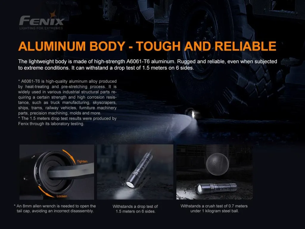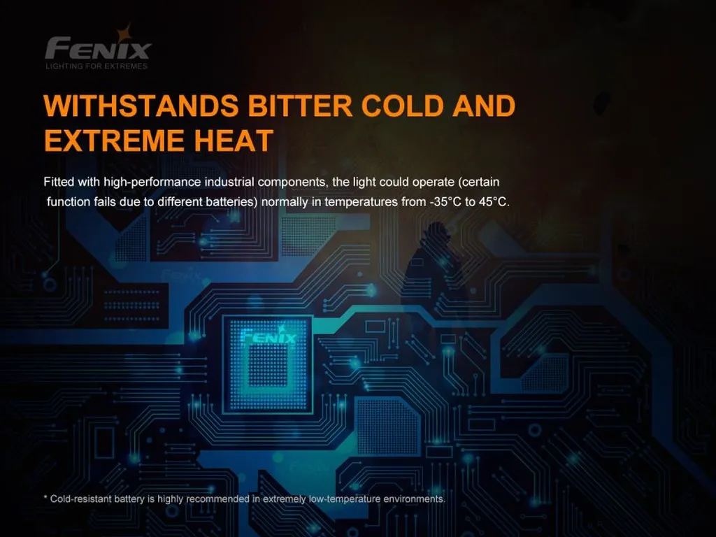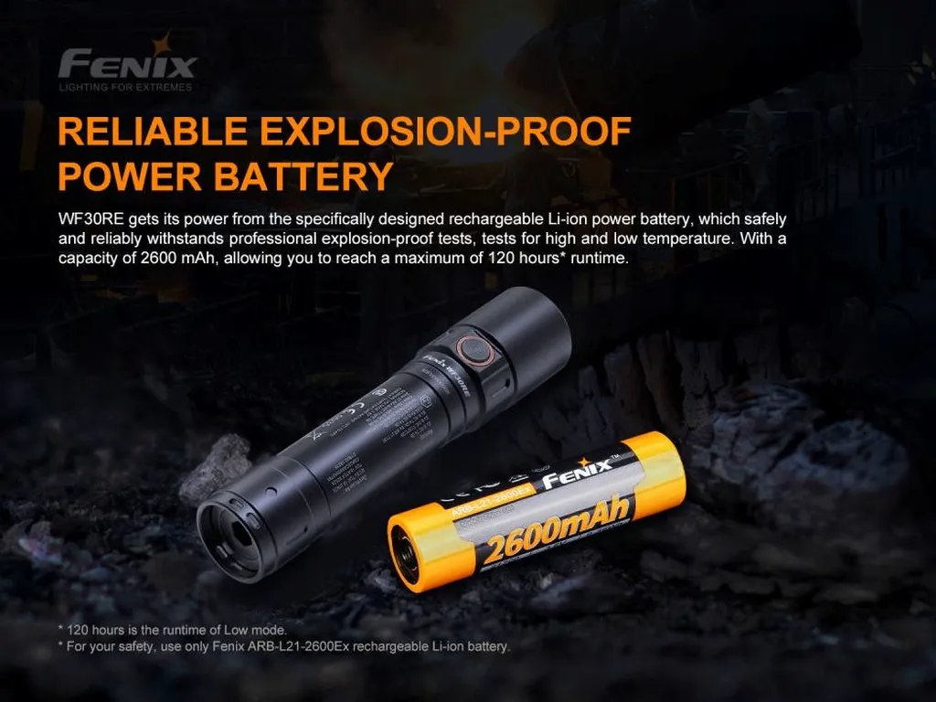 • Powered by one Fenix ARB-L21-2600Ex rechargeable Li-ion battery.